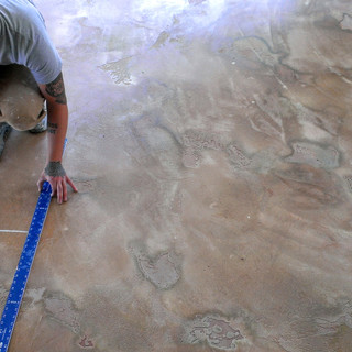 We started with a 65 year old concrete porch and patio. Both were badly stained, cracked, and pitted. We ground off the old dirt and stains, applied an overlay coating, stained with a combination of 3 colors, and sealed with an epoxy top coat. The result is a beautiful new floor resembling tile. The durability of this flooring is unmatched in traditional flooring options.
